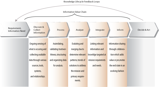 An “information sharing value chain” (ISVC) is the metaphor by which ConvergeITS has developed its KM core capability. The ISVC articulates the “opportunity” of information sharing to support informed decision making, shared situational awareness and improved knowledge consumption at every level of an organization, program, or project. The risks encountered at each step of the information sharing value chain are managed to mitigate negative consequences.ConvergeITS refers to this as “information mobility.” Knowledge can be created at any of the boundary points along the information mobility value chain. We call this the discovery of knowledge disclosure points and is the foundation for shared and user-defined situational awareness. Trusted information must be made visible, accessible, and understandable to any authorized user in an organization or to external partners and stakeholders except where limited by law or policy.